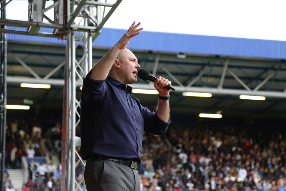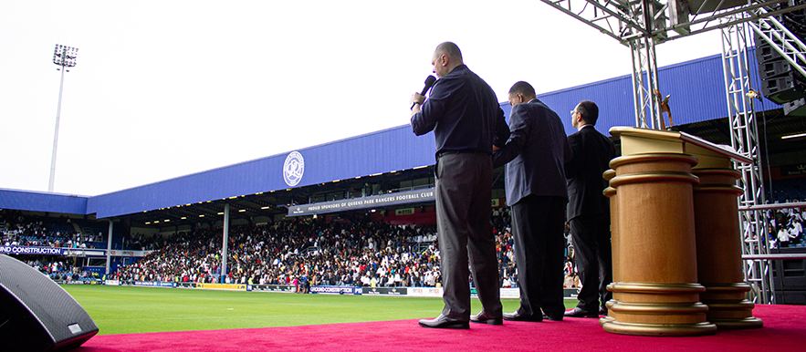 “Somos el ministerio joven del UCKG. Habéis visto a muchos jóvenes perder sus vida por el crimen. Nuestro trabajo es mostrarles que hay una salida. Este estadio lleva el nombre de un jugador de fútbol que perdió la vida por un crimen con arma blanca, por eso vamos a orar por su familia y por usted también,” dijo Pr Ade, refiriéndose a Kiyan Price, un joven de 15 años que perdió su vida en 2006. Luego llamó a un joven que antes estaba destruyendo su vida por la violencia de pandillas, pero que cambió totalmente gracias a la ayuda que ofrece el VYG. Y dijo: “Mi consejo para los jóvenes es que se desahoguen. Hay ayuda disponible para ti, así que ven al VYG, habla y haz que esta ayuda se aplique en tu vida.” Pr Ade luego hizo una oración por todos los jóvenes en el estadio y en el Reino Unido en general.
