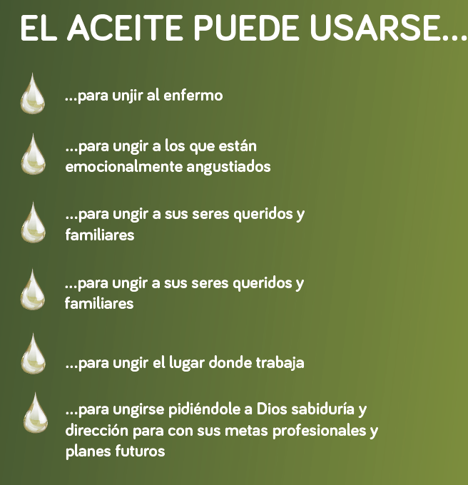 Simplemente coloque una pequeña cantidad de aceite en el objeto, lugar o lo que represente dificultades o desafíos en su vida, y haga una oración pidiendo la intervención de Dios. Recuerde, es su fe en Dios lo que provoca el milagro; Así que, crea y no dude.