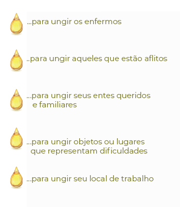 Coloque uma pequena quantidade do óleo no objeto, local ou o que quer que represente as dificuldades ou os desafios em sua vida e faça uma oração pedindo a intervenção de Deus.